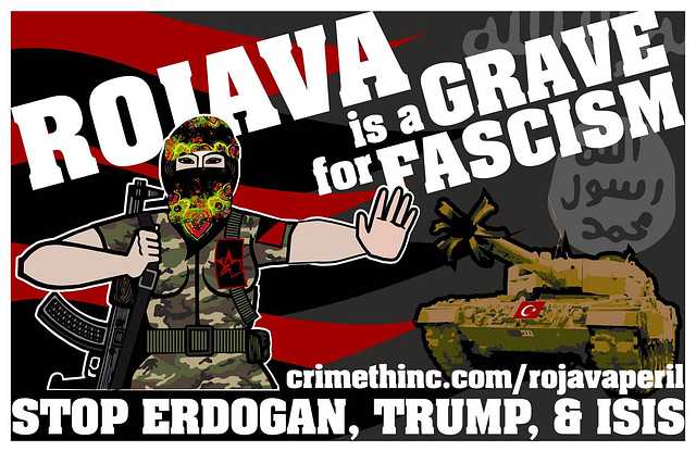 This is not the first time that the revolutionary experiment in Rojava has confronted these same forces. In solidarity, we prepared an updated version of our previous poster supporting the struggle against Recep Tayyip Erdoğan, Donald Trump, and the Islamic State. This new version presents a link to an analysis from American, Chinese, and Russian anarchists who have fought to defend Rojava, discussing the situation in February 2026.